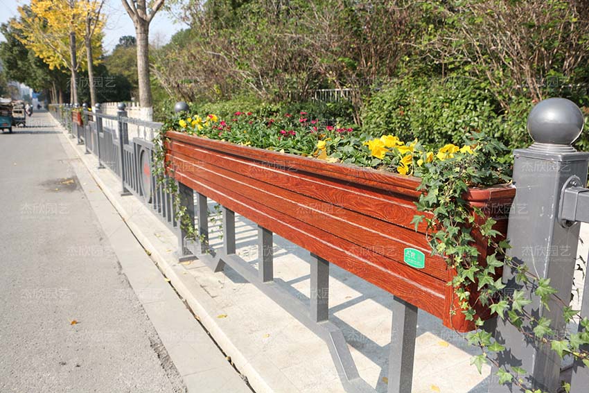 这款是浙江义乌做的花箱护栏,当时要举办义博会。这款花箱护栏的规格是花箱100厘米(长)*50厘米(宽)*90厘米(高), 栏杆300厘米(长)*60厘米(高)。