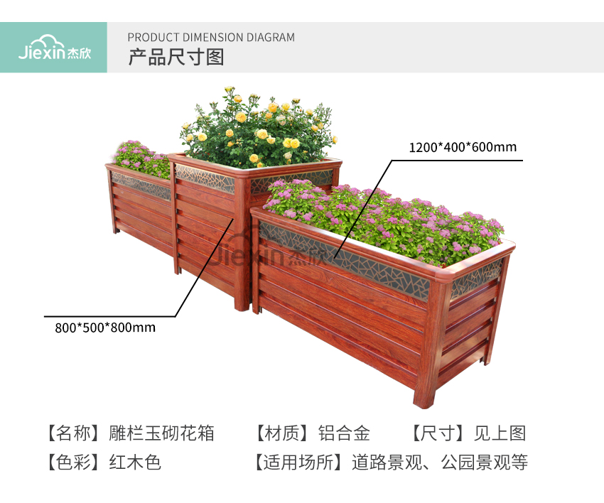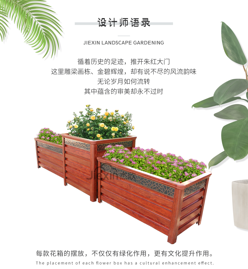 红木色铝合金花箱让人想到城市的文化、想到古城、朱门。