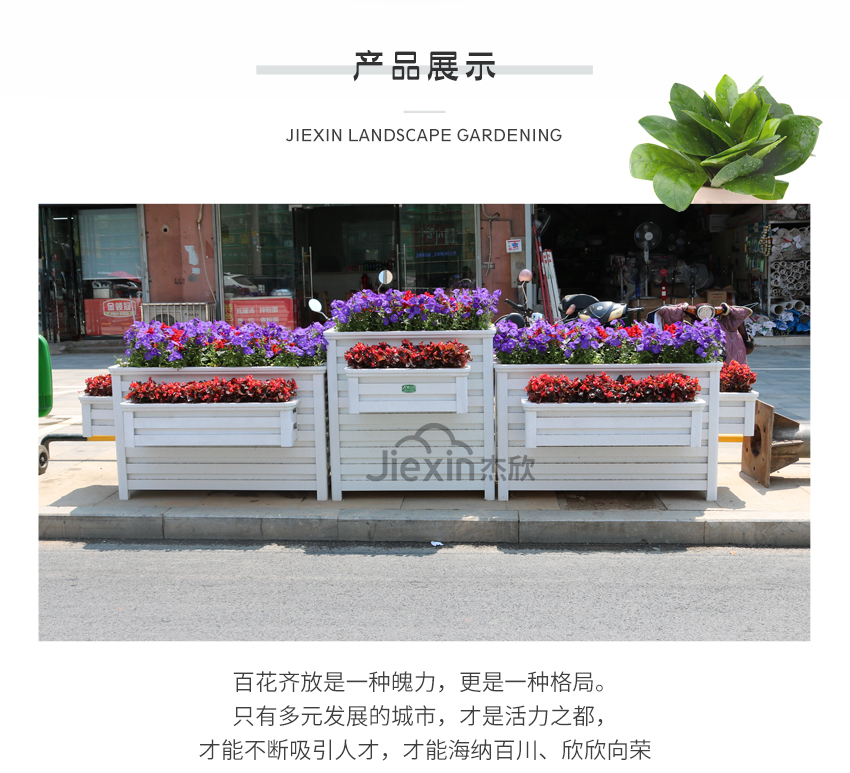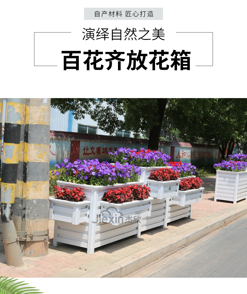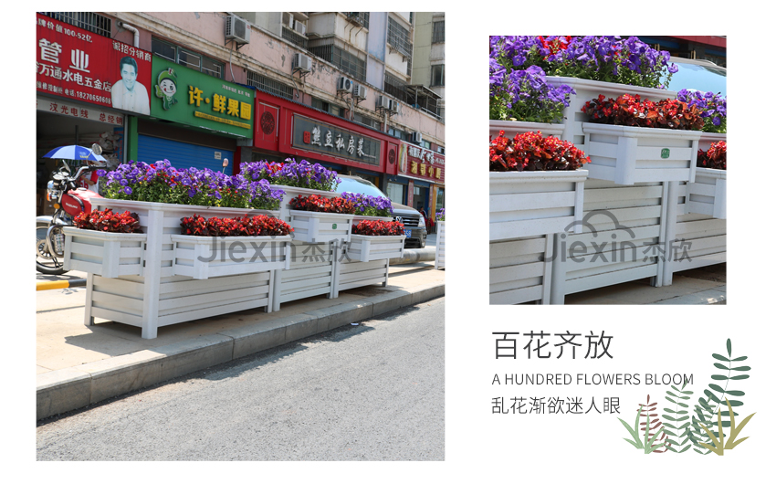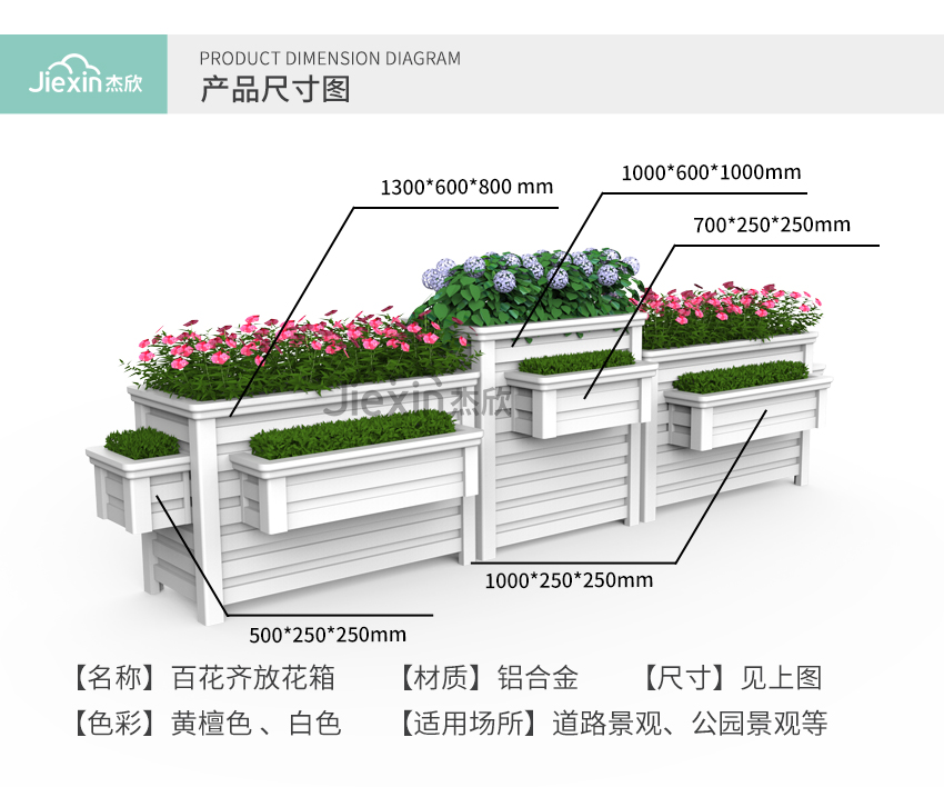 组合花箱的材质是铝合金,防腐耐磨、坚固耐用,能够在户外使用二十年。