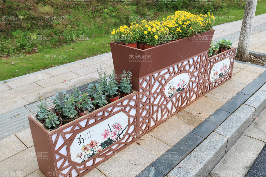 以菊色窗景花箱为例,采用菊文化元素,以窗景造型为特色,表现出浓厚的历史文化传承。镂空造型呈现出的虚实相生,古典画面呈现的意境悠悠,无不展现出城市的深厚文化。