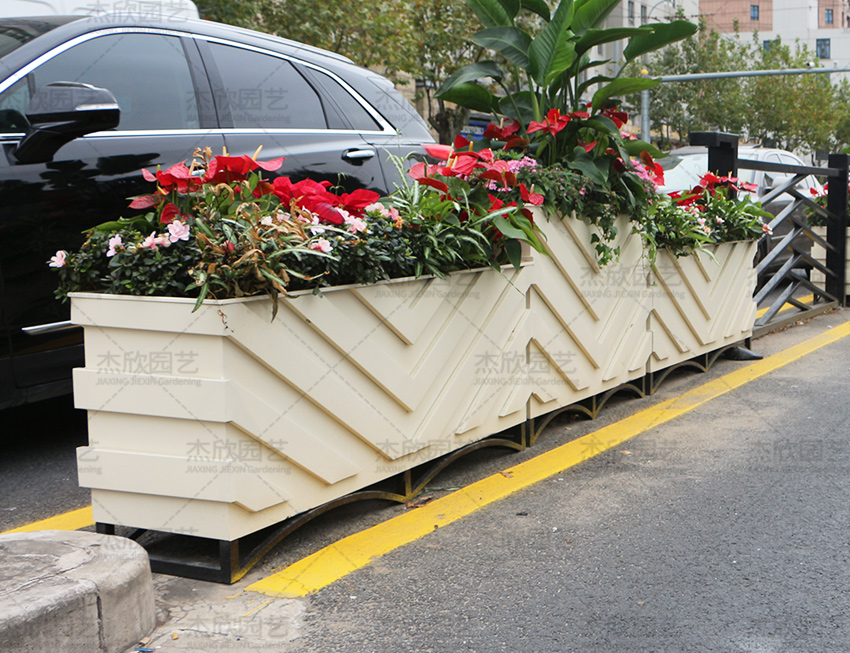 相较铝合金花箱、PVC花箱,钣金花箱有自身突出的优势。铝合金花箱,造型简洁,美观性不足,钣金花箱同属金属类花箱,却将造型之美发挥淋漓尽致。PVC花箱虽美观靓丽,使用年限却不长,钣金花箱充分展现了金属产品耐腐蚀、耐磨损性能,可用二十年。
