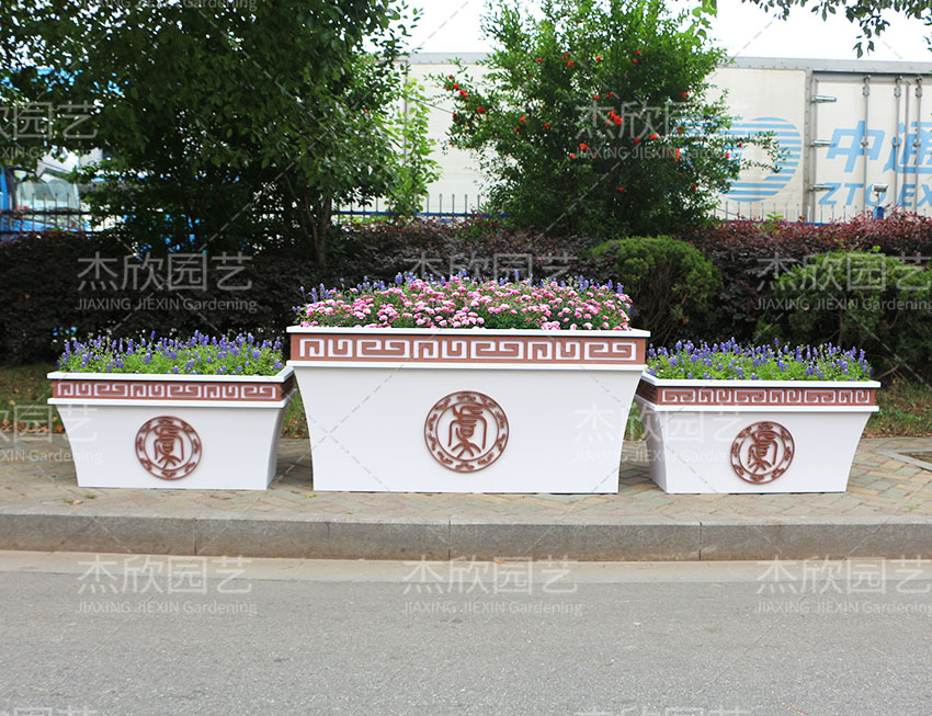 这款花箱以回纹为元素,富有浓浓的古典美学和意境。造型偏古典,通过篆体文字点名城市文化,适用性广泛,既灵活又富有创意。