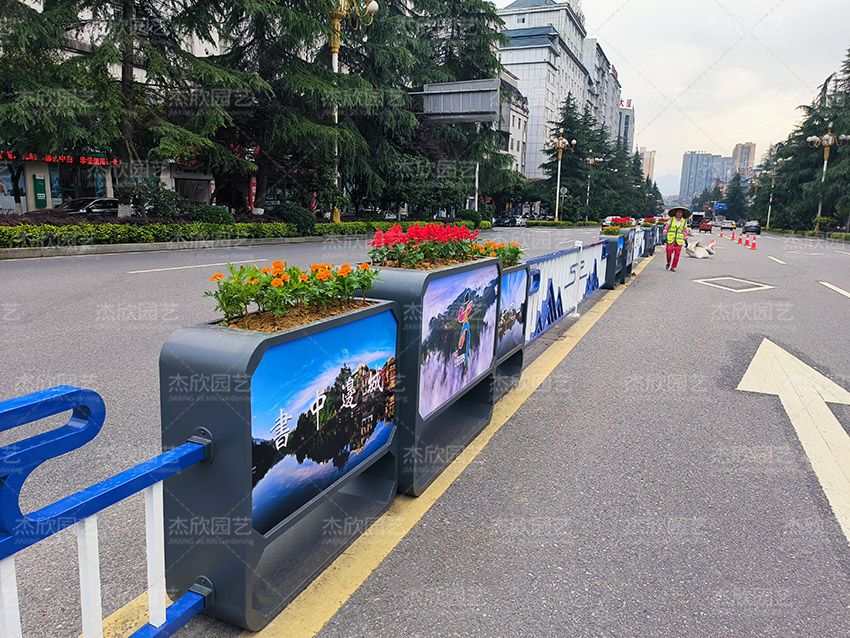 道路花箱护栏,既提供了百花的承载体,也匹配了城市道路景观的要求。
