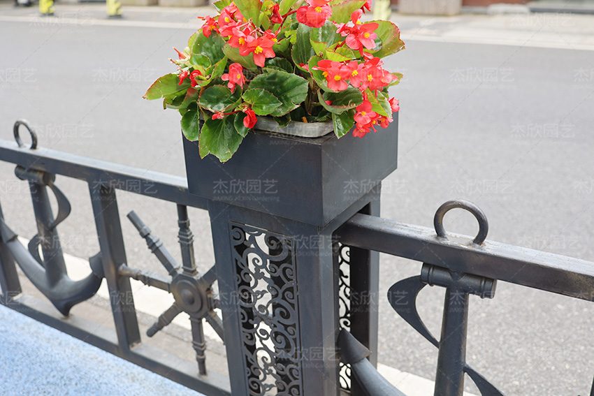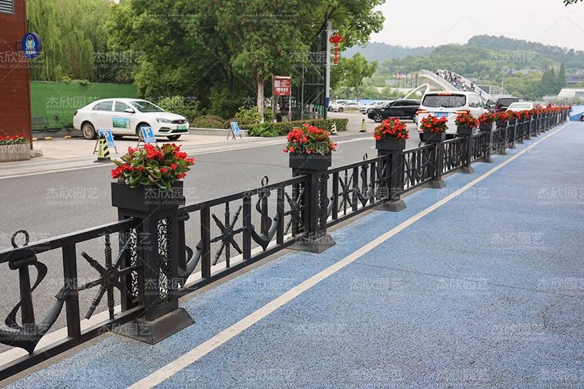 道路隔离护栏便于景区管理,优化出行,草花布置,有利于提升场景的美观度。