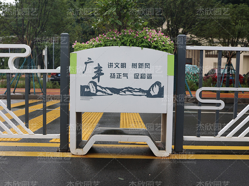 景观护栏以山水为主元素,简洁诗意、如临画境,轻盈的山水白云间,呈现出自然生态的飘逸感。花箱上字体与图画,让人一秒走进了广丰的天地。