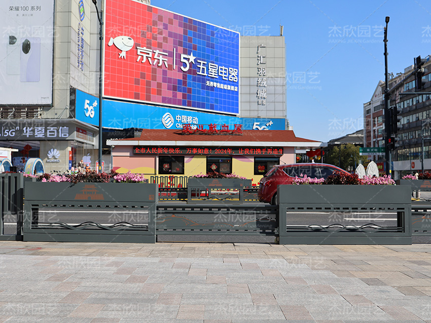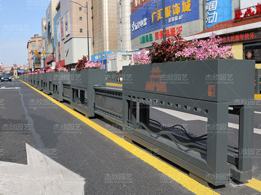 南通道路花箱创新设计了可移动护栏,使得隔断变得简单。当需要隔离时,将护栏移动连接,当不需要隔离时,将护栏归于原位。