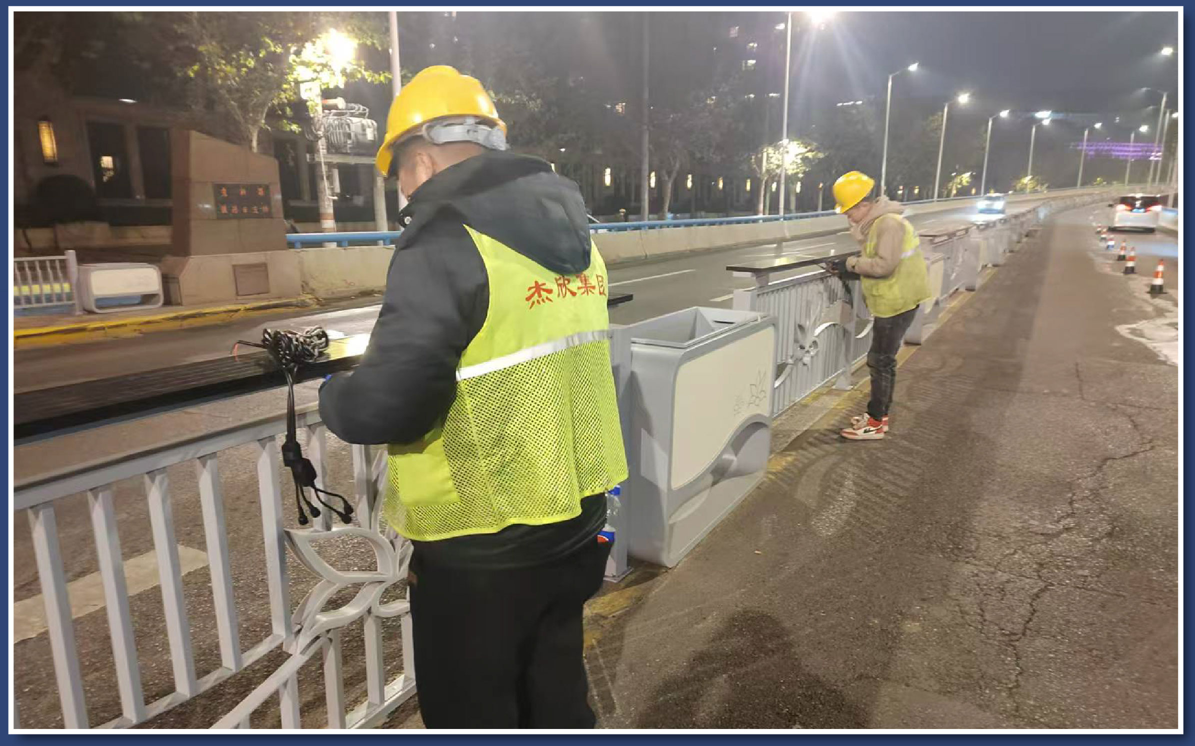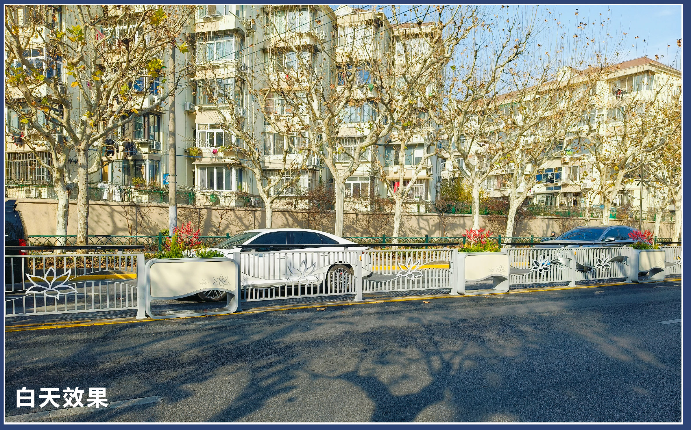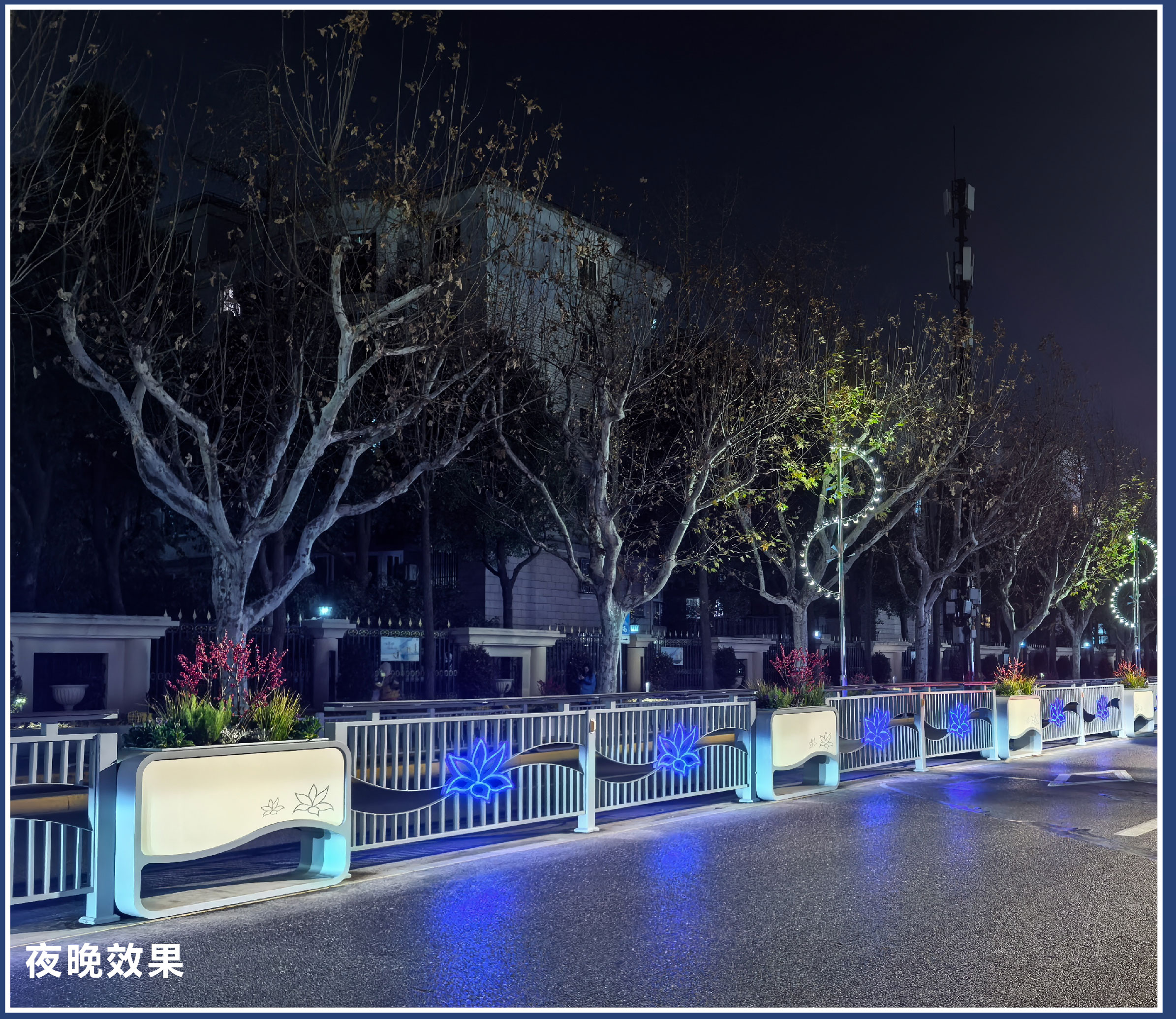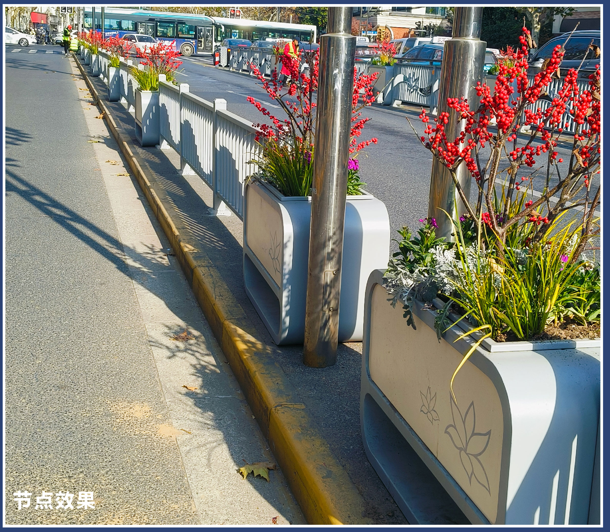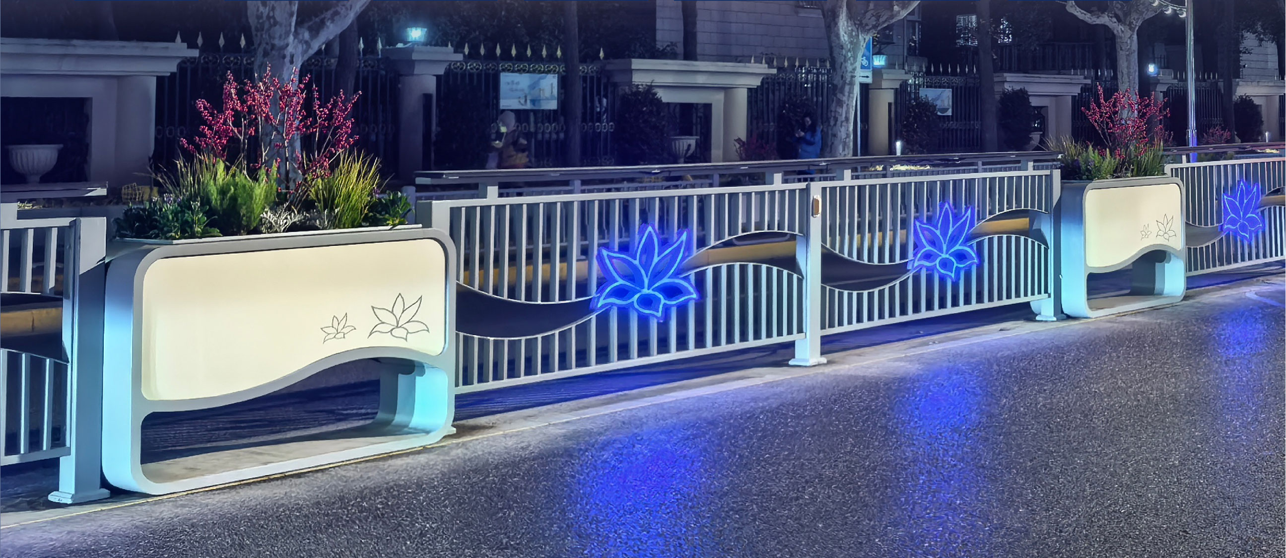 杰欣集团的花箱护栏布置为上海晋陀区带来了生机与活力。花箱中的花卉植物不仅可以美化城市环境,还能净化空气、调节气候。在整体色彩协调方面花箱护栏的颜色和花卉的搭配与城市的整体色调相呼应,同时傍晚护栏中的灯光照明效果,使上海更加温馨、舒适、时尚。在空间功能性上,花箱护栏可以作为城市道路的中央隔离带,划分来往车辆的功能区域,增加城市的交通互动空间。