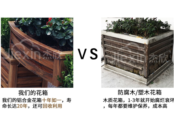 木纹铝合金花箱使用寿命可达25年以上,无需维护,还可回收再利用,节能环保,而且铝合金花箱组装方便,生产速度快,更好的解决了客户的燃眉之急。运输方便,可以发半成品到目的地组装,也可以发成品直接摆放,运输过程中不易损坏,无需打木架,节省包装费用,吕代木时代已经开启,而且随着科技的发展,会有越来越多的新型花箱材料诞生,为社会节能环保事业做出贡献
