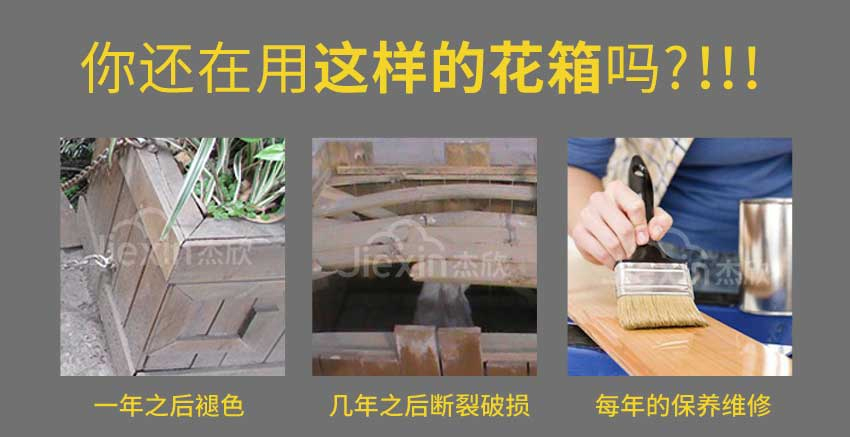防腐木花箱,虽然造价成本较低,但是使用年限太短,一般使用一年以上就开裂变形,发霉变质,而且制作工期较长,耗时耗力,逐渐被一些新型花箱材料替代。