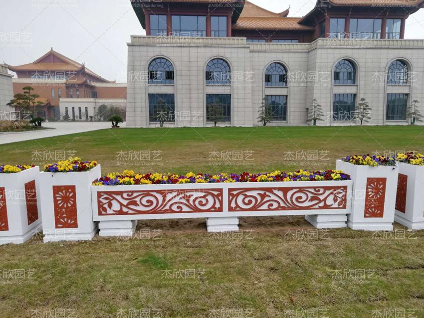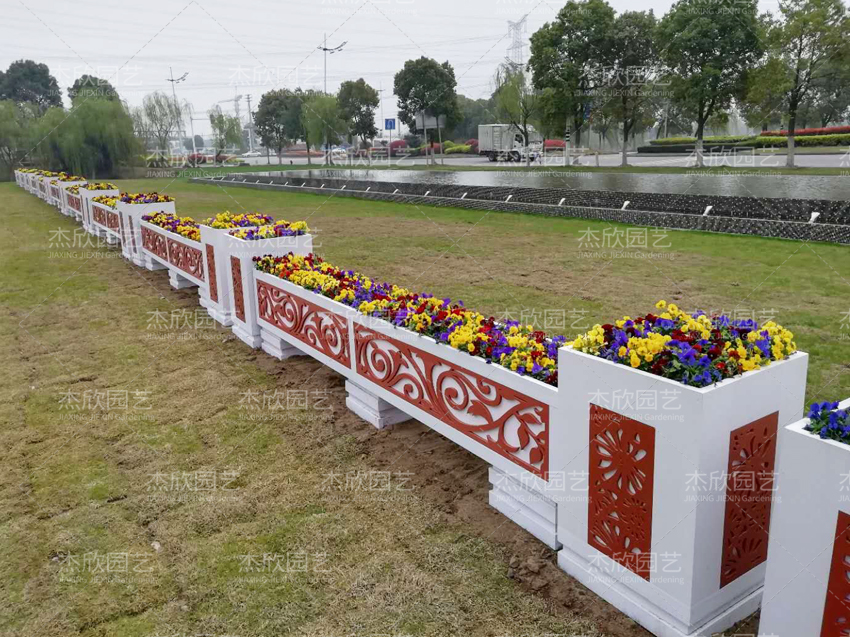 pvc花箱的柔韧性佳,加工性能强,能根据需要定制图案。PVC花箱外部雕刻细腻,色泽一致,图案美观。适合道路美化工程。