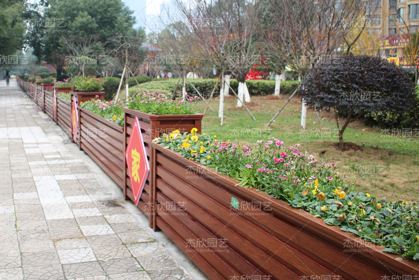 景观效果:红木色木纹花箱,融合公园景观和街景效果。