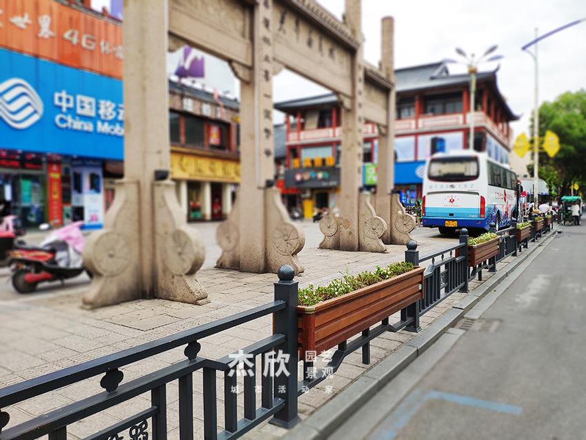 花箱护栏不仅起隔离绿化作用,更与步行街融为一体,增添美感。